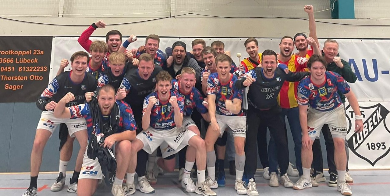 Gewonnen wurde das Spiel heute durch eine Teamleistung. Jeder auf der Platte hat performt, um uns diesen Sieg hart zu erkämpfen: unser Handall-Opa Daniel legte dafür sogar eine 60-Minuten-Performance auf das Parkett – nicht einmal eine zwei Minuten Pause gönnte er sich heute; Malte sorgte mit seinen neun Toren mal wieder für Sicherheit im Abschluss, unsere Torhüter, die neben den Würfen aus dem Feld auch zwei von fünf 7m für uns eroberten – einen davon, als es wirklich zählte; Bjarne, einer unserer Jungspieler, der nach dem kurzfristigen Ausfallen von Jesper auf Linksaußen einsprang und mit sechs Toren sein bisher stärkstes Spiel der Saison zeigte; nicht zu vergessen die Unterstützung der Löwen aus Mölln (zu sehen im Bild oben in rot-gelb), die sich an einem Dienstagabend auf den Weg machten, um uns anzufeuern und mehr Stimmung für uns machten als die Lübecker für sich selbst!